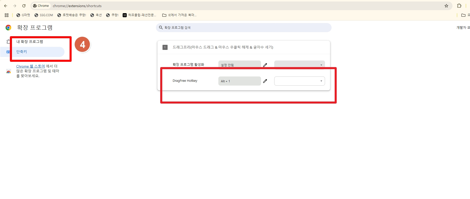 설치 여부를 확인하기 위해 확장프로그램 클릭을 합니다. 항목중 [드래그프리] 확장프로그램을 확인 합니다.